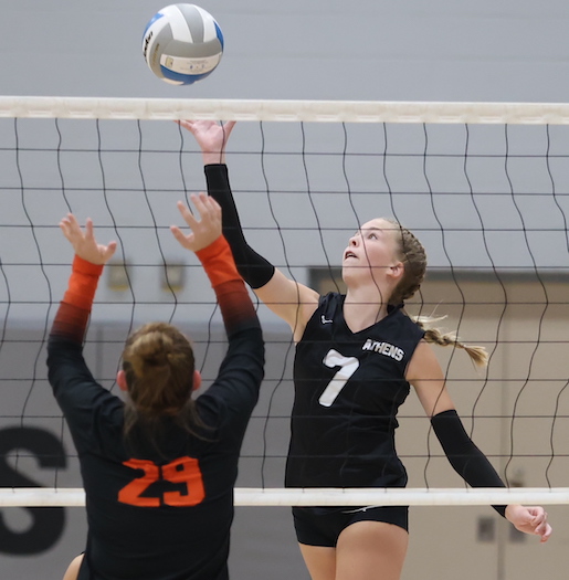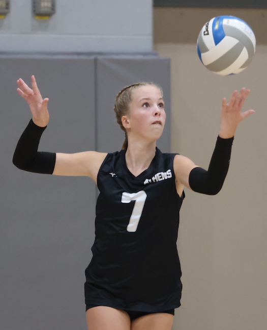Sophomore Ellie Mosher led Athens with 15 kills and 16 digs, while junior Meg Wiles had 17 setter assists and four service aces, and freshman Kayla Forbes had 16 digs, two aces, and 21 serve-receives.