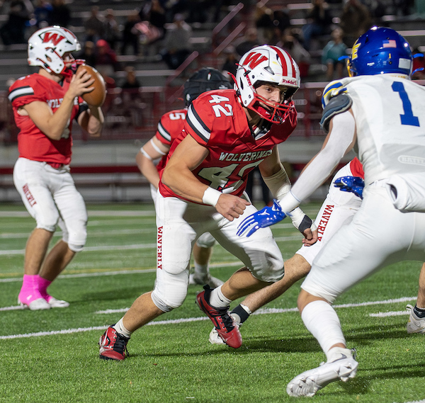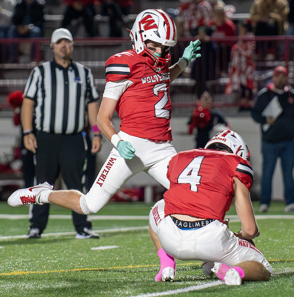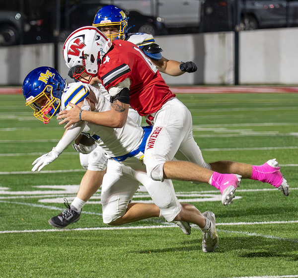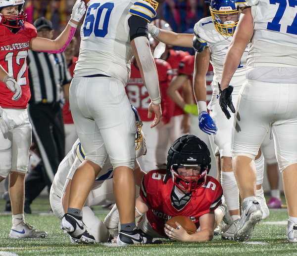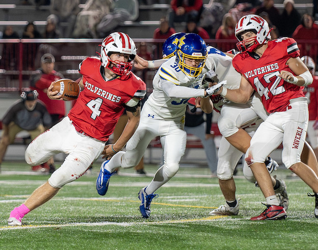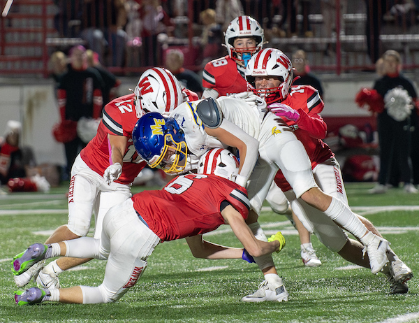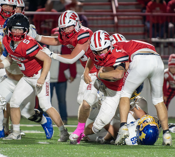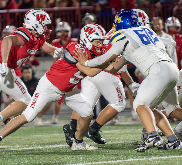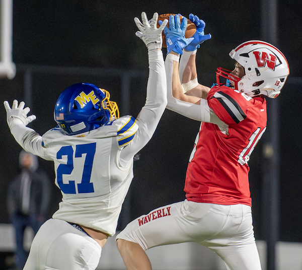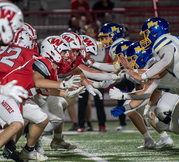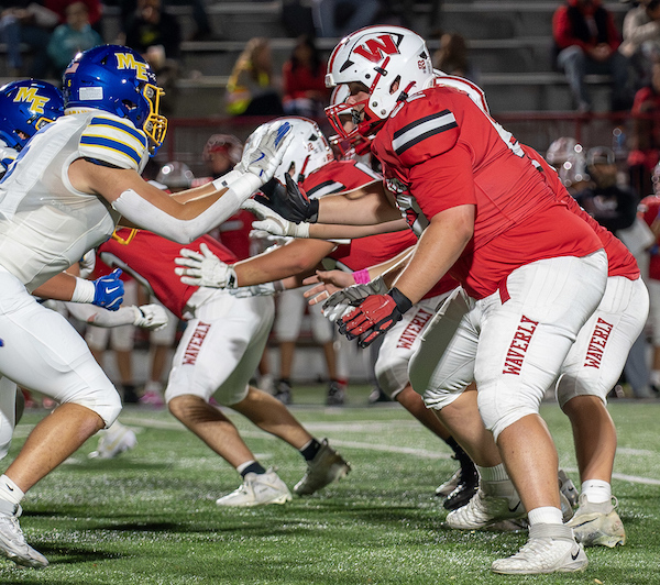 A 10-yard pass from Oecker to Marco Konrad gave M-E a manageable fourth-and-3 at the Waverly 24, but Ben Shaw and a host of teammates dropped Oecker at the line-of-scrimmage to force a turnover on downs with 7:08 remaining in the game.