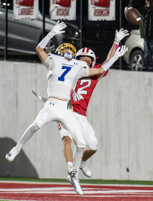 The Spartans again answered with a quick five-play, 83-yard drive that featured a 45-yard run by Marco Konrad and a 25-yard run by Smallcomber. It was capped by a 12-yard TD pass from Oecker to Policare with 4:15 remaining in the third quarter. Policare's conversion run made it 20-13.