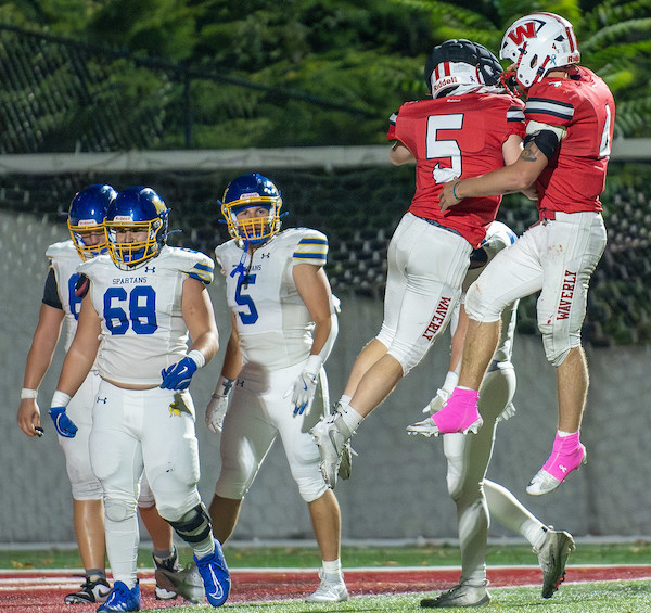 Following the ensuing kickoff, Waverly was flagged for a hold, then Ben Shaw's pass on first-and-20 was picked off by Joseph Chesna, setting the Spartans up at Waverly's 33.