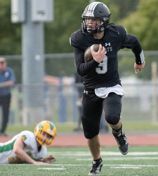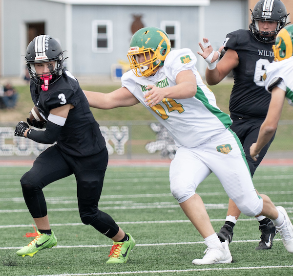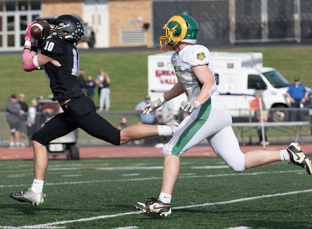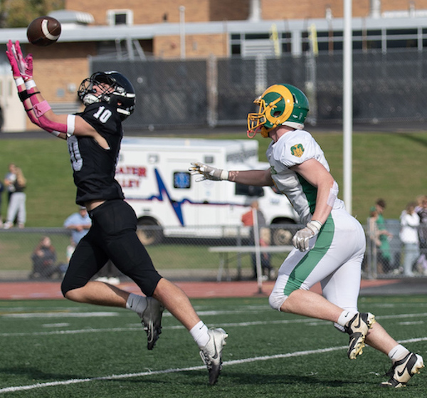 Junior QB Connor Davidson then unleashed a deep ball intended for senior James Friend, who got a hand on the pass. Junior Gage Marmor made a diving catch off the deflection for a 63-yard gain to the Wyalusing 9.
