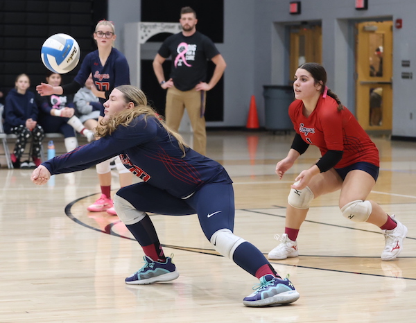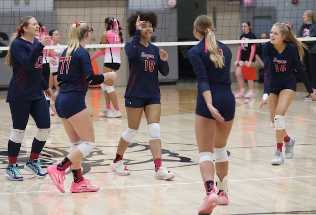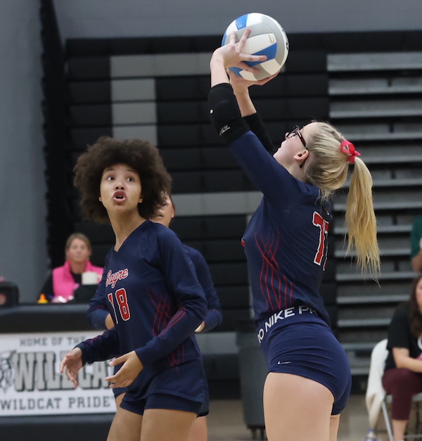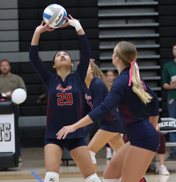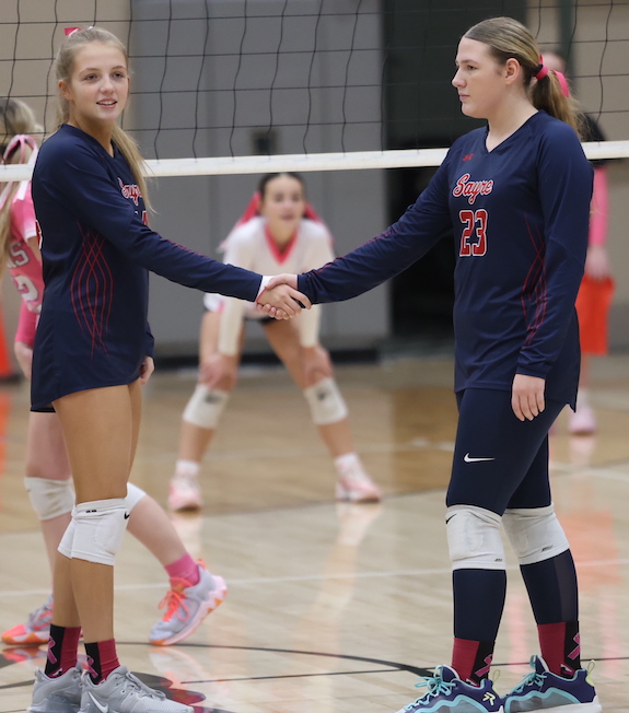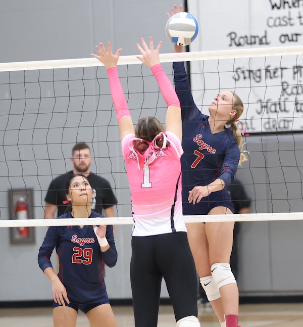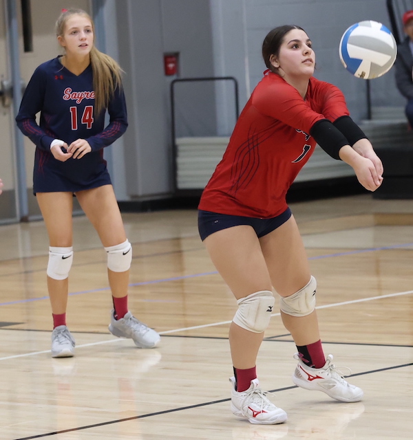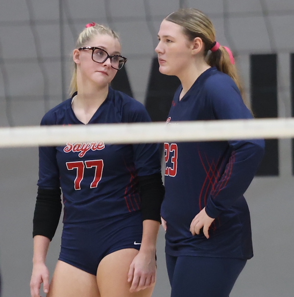 Service runs by sophomore Reghan McGaughey and junior Yhale Doon early in the second set helped Sayre to a 12-5 lead.
