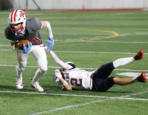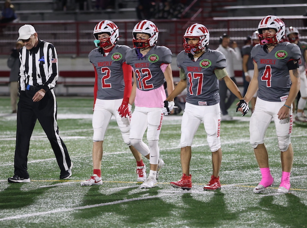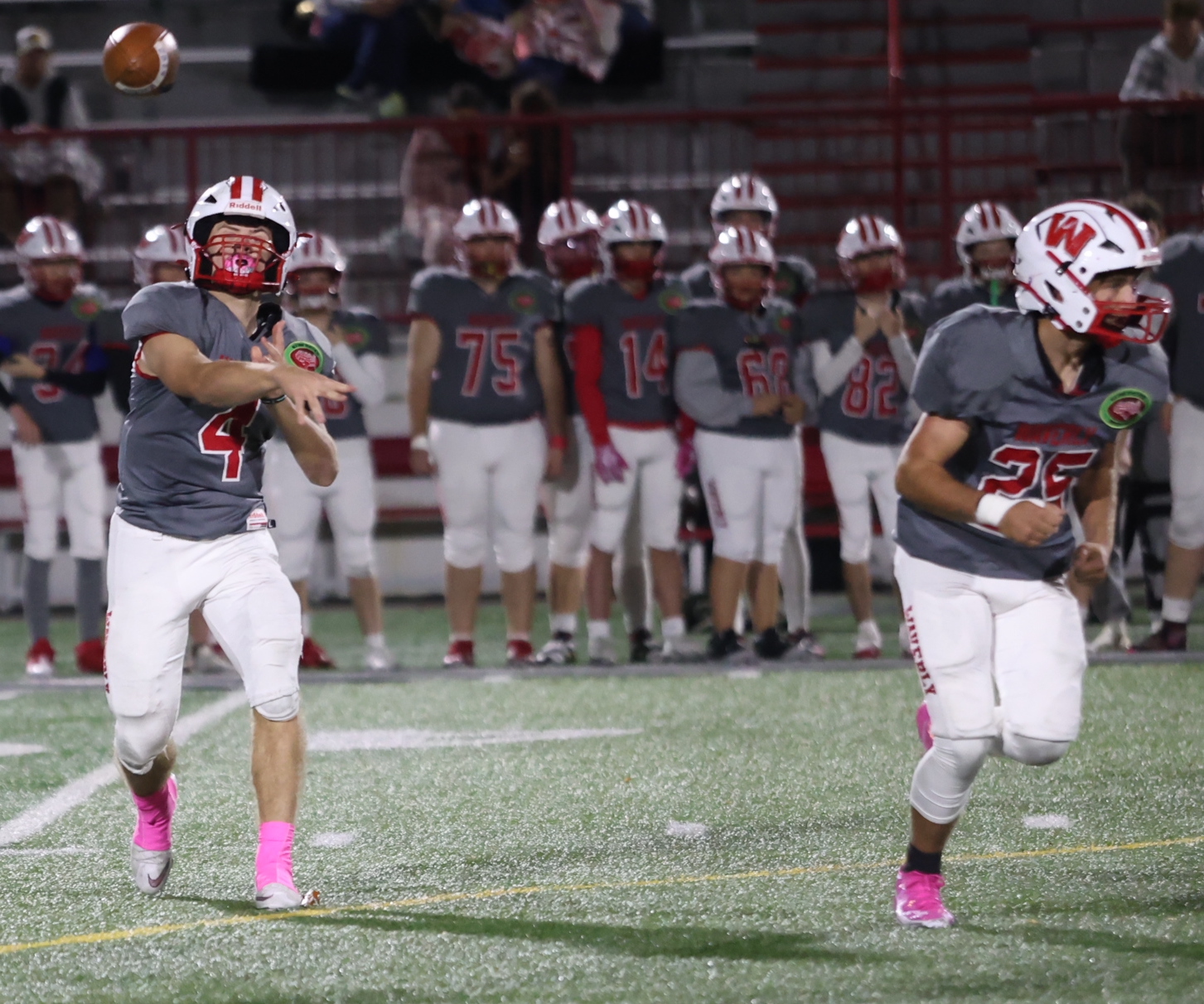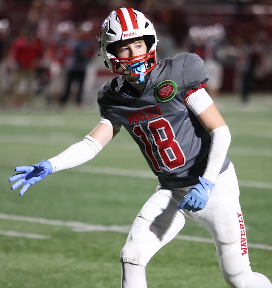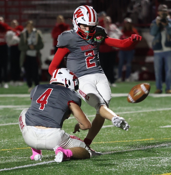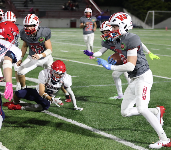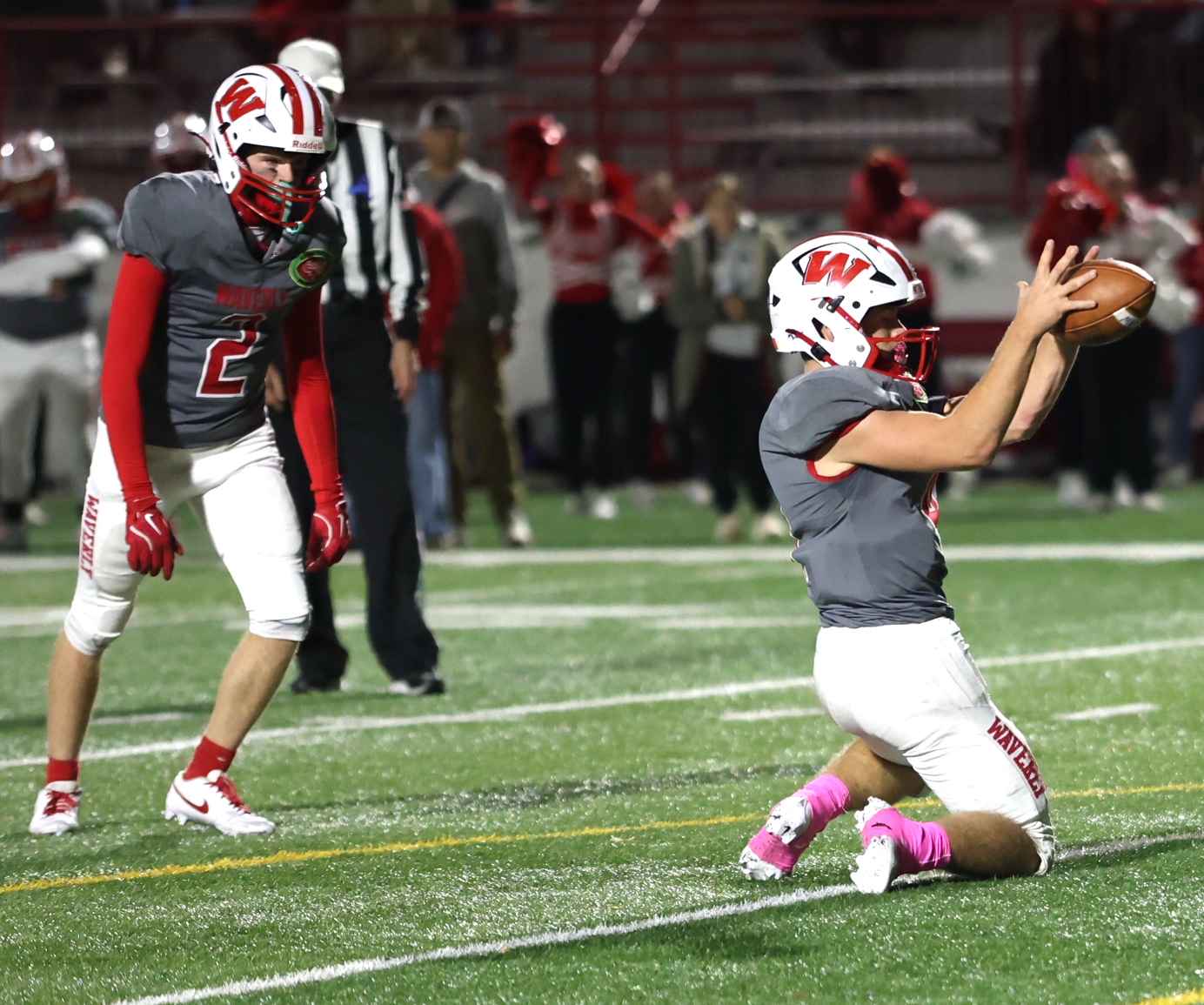 After another nice kick return by Laforest set the Wolverines up at their 49, Waverly pieced together a 10-play scoring drive, capped by a leaping grab in the end zone by Welles for a 4-yard TD reception to close the gap to 24-13 with 5:30 left in the game.