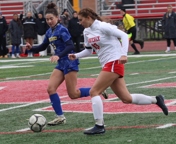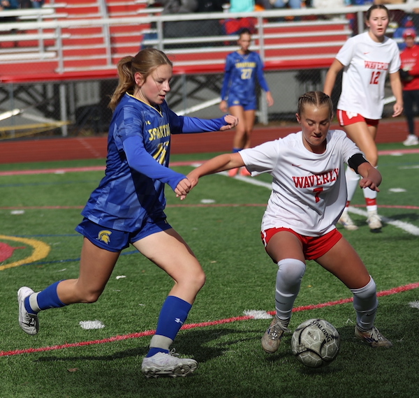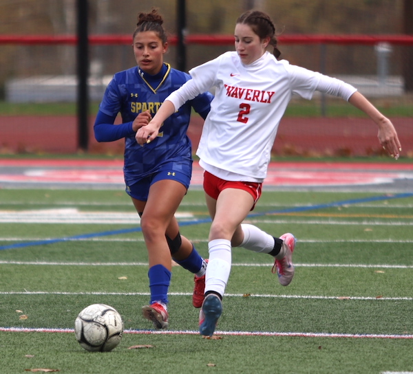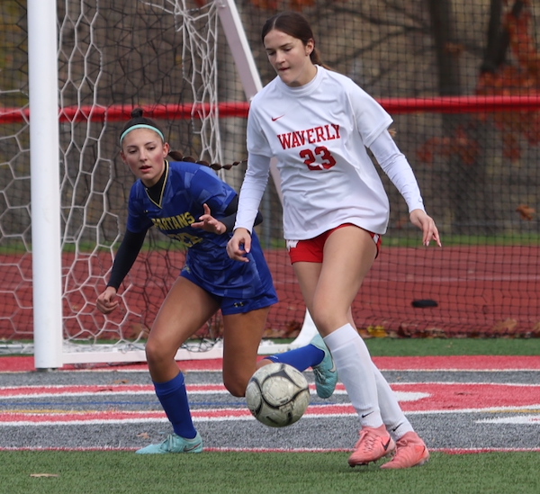 Just three minutes and 15 seconds into the game, Gianna DeSantis ripped a high, arching shot from about 35 yards out that Waverly keeper Claire Clonch got a hand on, but could not push over the crossbar.