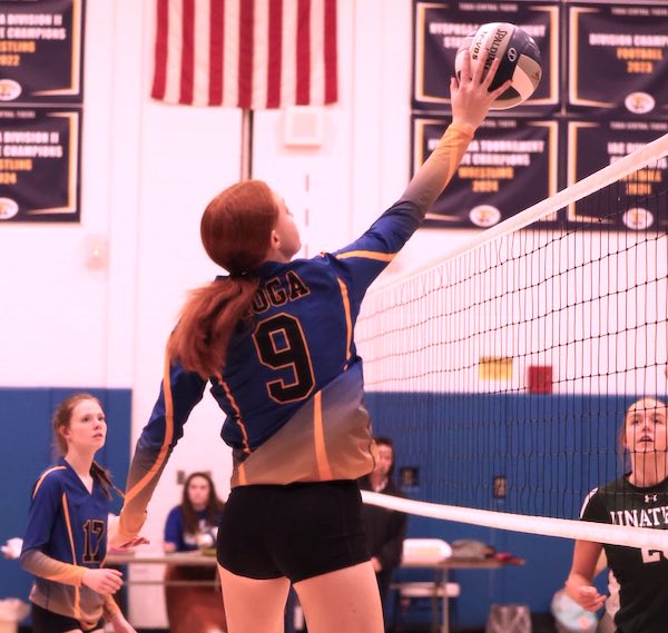 A Tioga miscommunication and a pair of hitting errors allowed Unatego to trim the lead to 7-3, but a pair of solid serves from Zorn, a Hall kill, and Mezzatesta’s hard smash to the back row followed by her own tap at the net pushed the lead to 14-5.