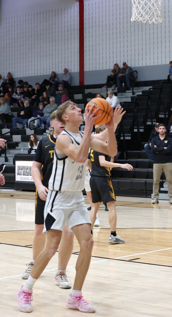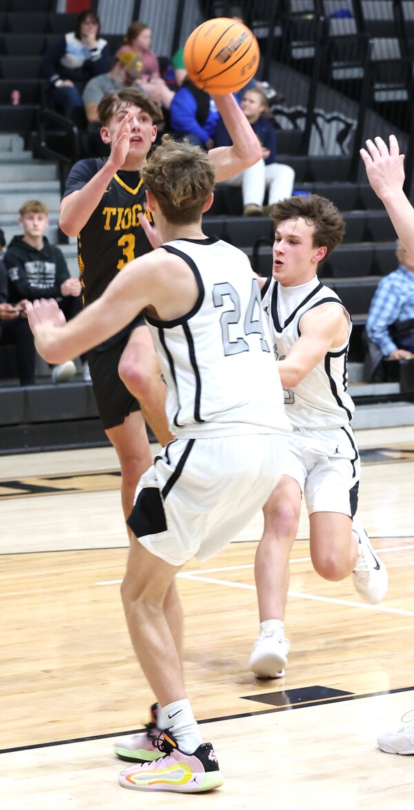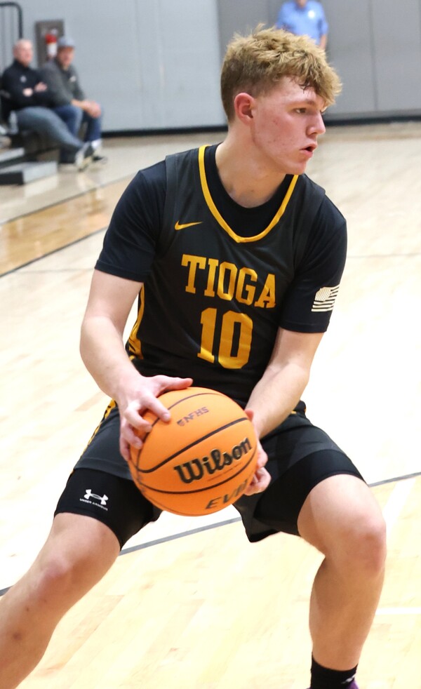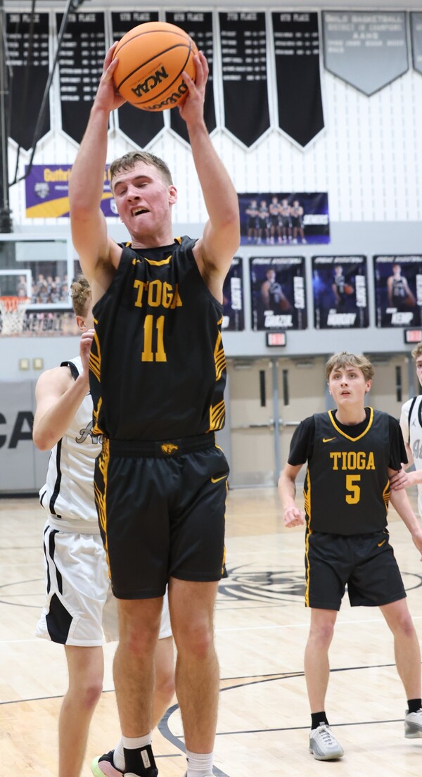 Jack Bombard led Tioga with 10 points, including a pair of consecutive 3-pointers from the top of the key. James Miller added one trey and finished with nine points, and Landmesser and Gavin Kithcart pitched in with six points apiece.