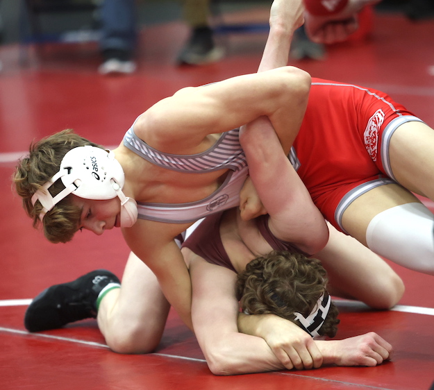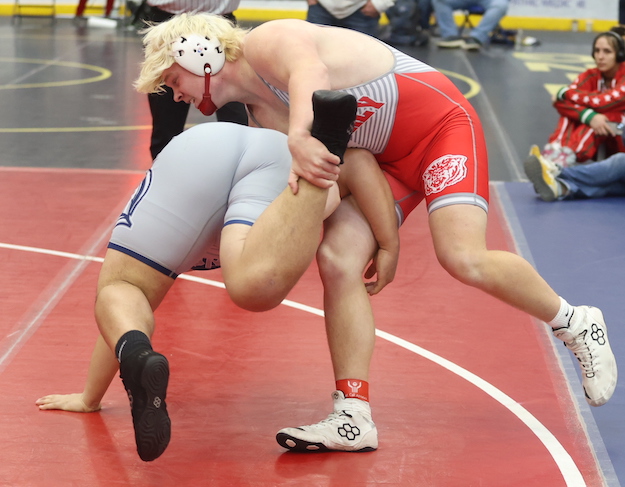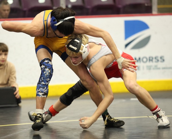 Seventh-grader Mason Phillips lost a 16-0 technical fall to Tioga's Parker Jackson in the 110-pound bracket.