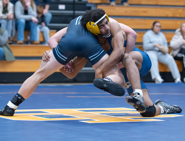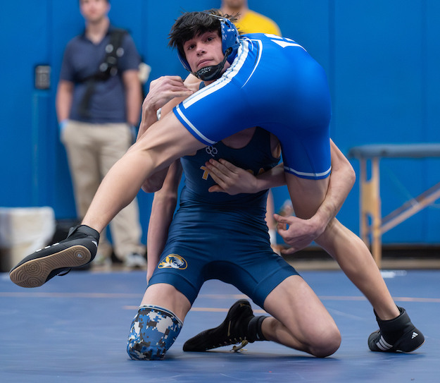 After the teams exchanged forfeits at 157 and 165 pound, Anthony Enders picked up the Blue Devils' lone win on the mat with a second-period pin at 175 pounds to close the gap to 52-12.