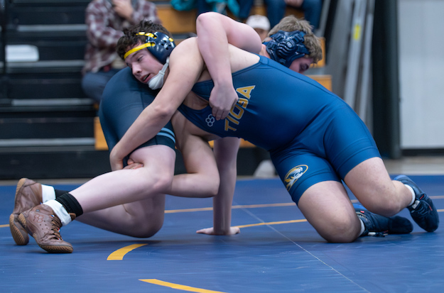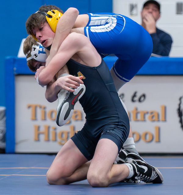 Sophomore Drayke Ulrich gave Tioga an early 6-0 lead with a pin of Nolan Miller in 3:14 at 103, but Connor McAllister answered for the Blue Raiders with a major decision to close the gap to 6-4.