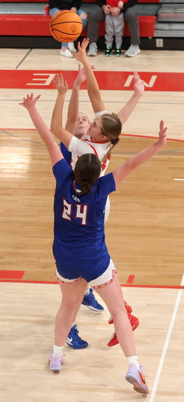 The River Hawks regrouped to tie the game at seven on a Searles 3-pointer and a Keely Wicklund basket before Judson and Hannah Carpenter made consecutive field goals for an 11-7 lead.