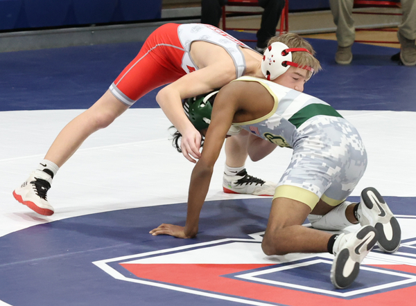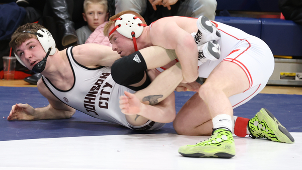 Cooper Robinson (157)advanced to the championship round as well, He was leading Johnson City’s William Ackley, 3-1, and was working to tilt the Wildcat standout when Ackley was able to grab and lift Robinson’s foot, and push back into him for a fall with 10 seconds remaining in the first period.