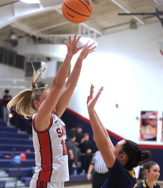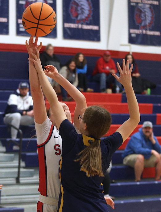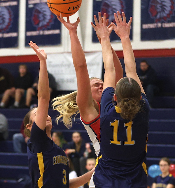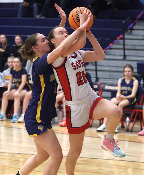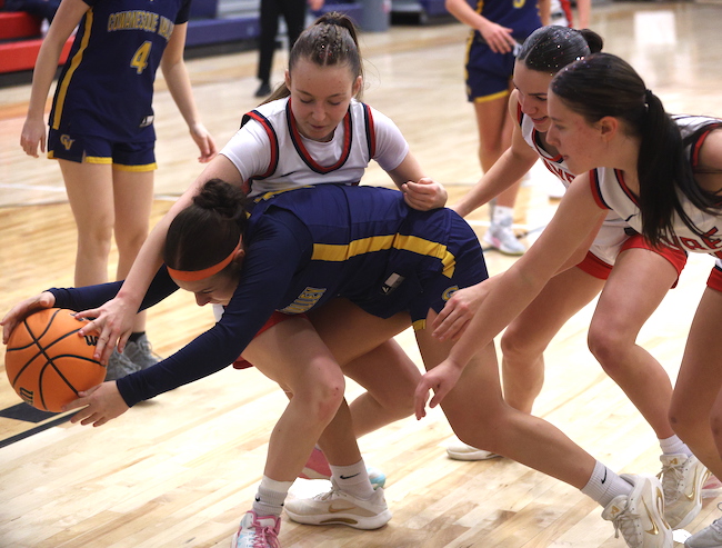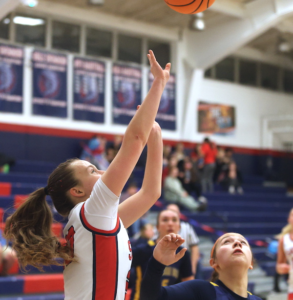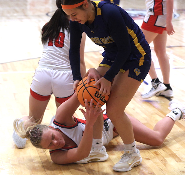 Freshman Afftyn VanDuzer scored a bucket early in the second quarter to close the gap to 12-6, then sophomore McKenna Parrish canned a 3-pointer to trim the deficit to 12-9, but CV hit a pair of treys in the final 2 minutes of the first half to take an 18-9 lead into the halftime locker room.