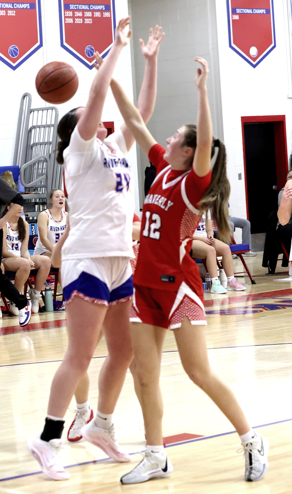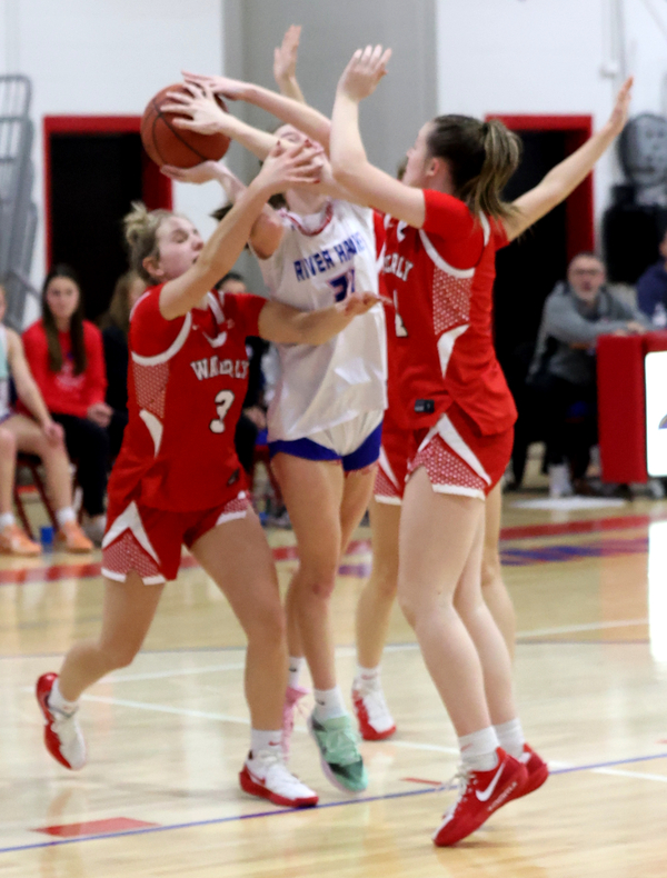 The River Hawks’ Marielle Searles exchanged baskets with Kaylin Twedt. Owego’s Jenna McEvoy pushed the lead to 35-33 on a pair of free throws with 2:06 on the clock.
