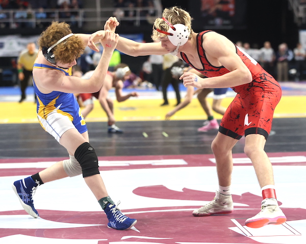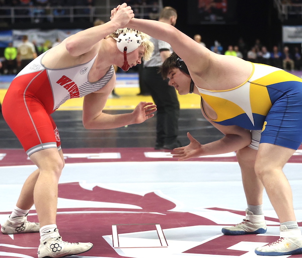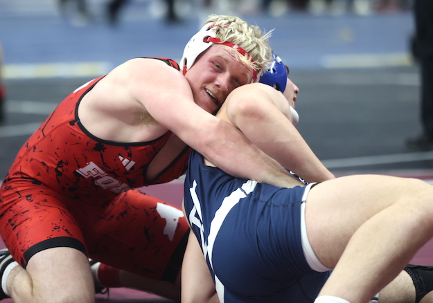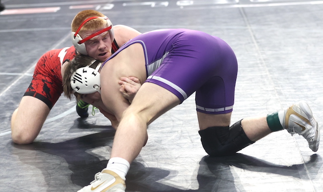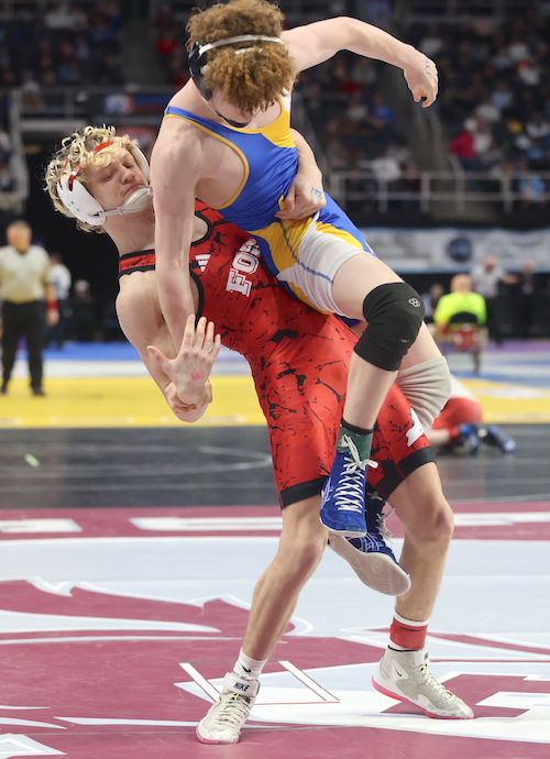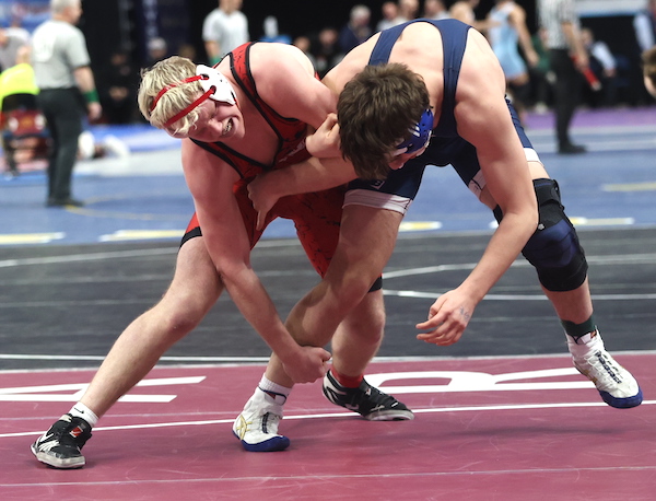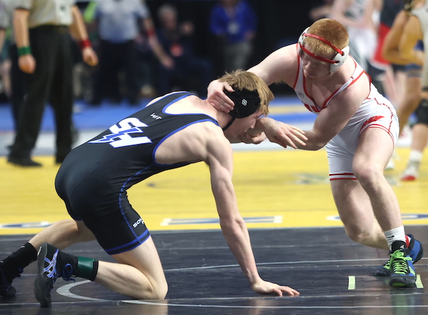 In the semifinals, Robinson got caught in a cradle twice, the second time top-seeded Jacob McVige of Honeoye Falls-Lima cinched tightly in the center of the mat for a fall at 2:45.